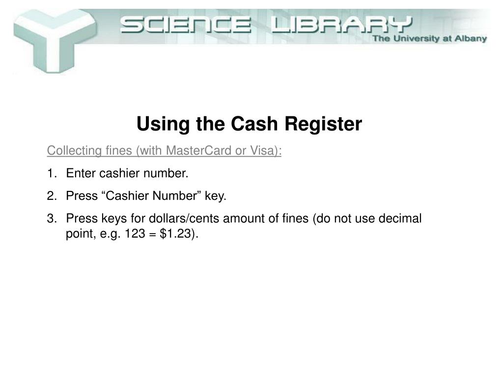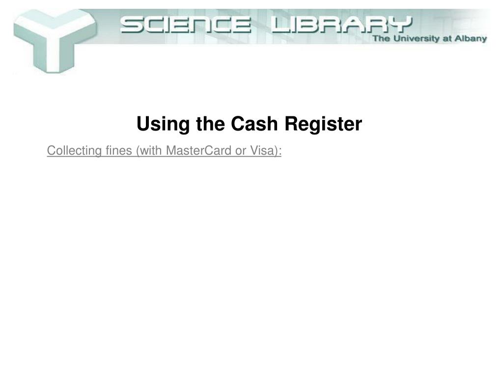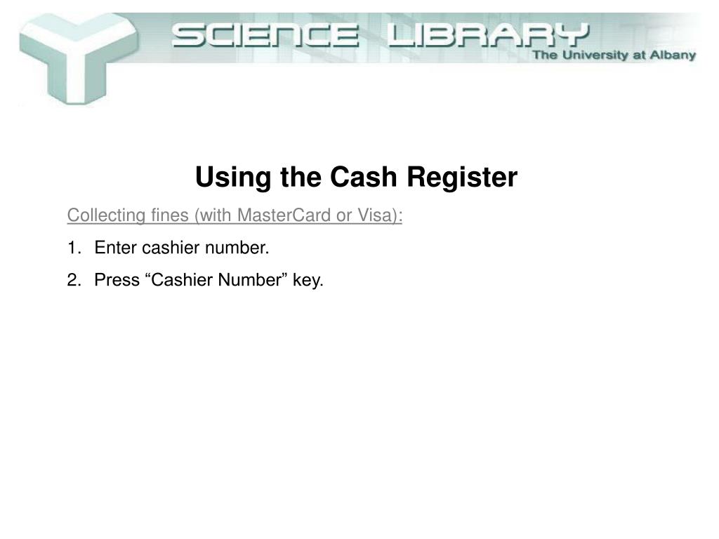 Using the Cash Register • Collecting fines (with MasterCard or Visa): • Enter cashier number. • Press “Cashier Number” key. • Press keys for dollars/cents amount of fines (do not use decimal point, e.g. 123 = $1.23).