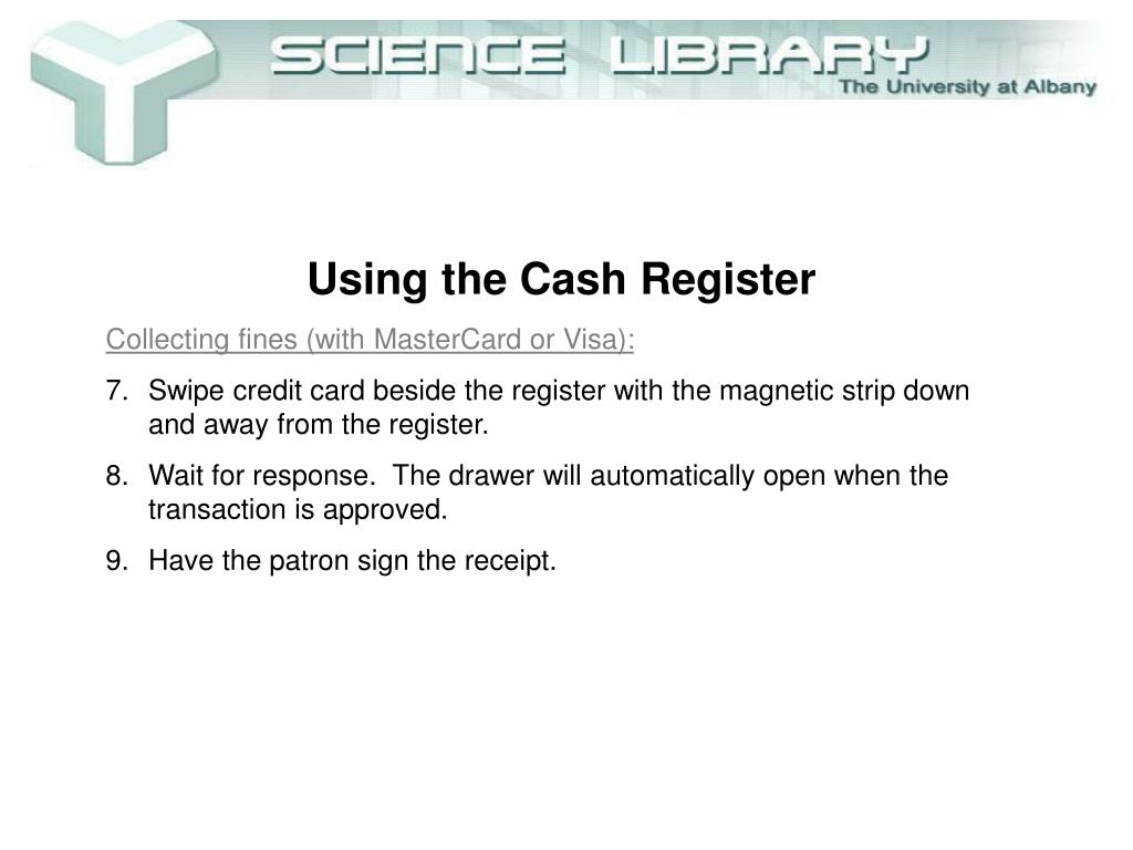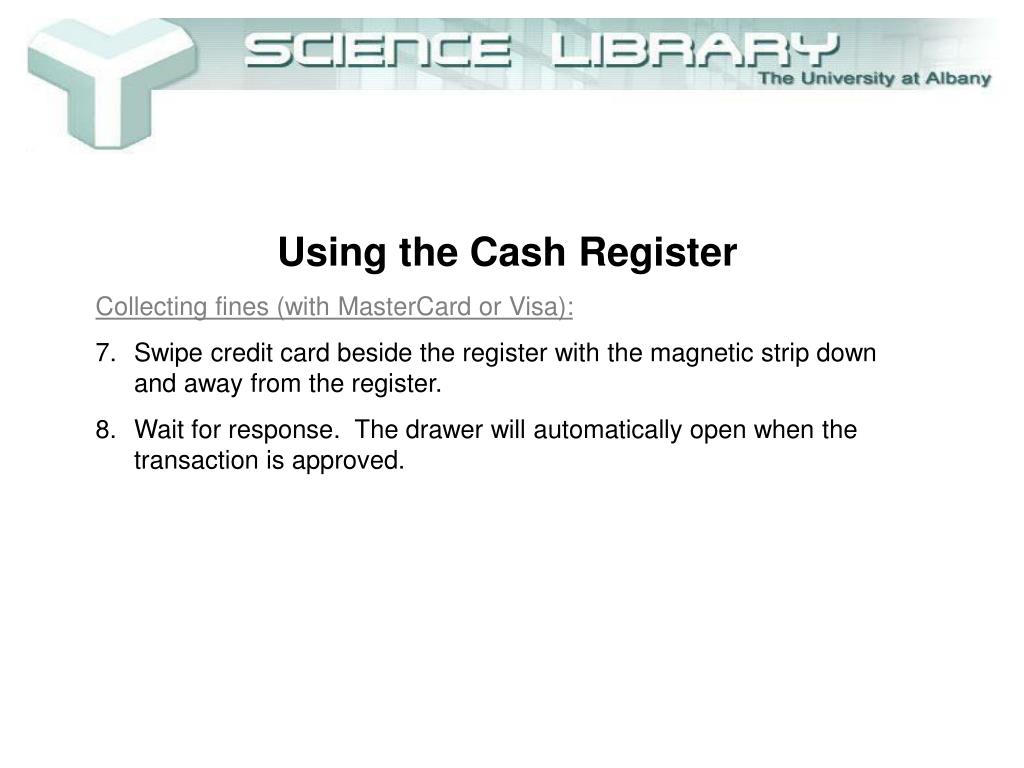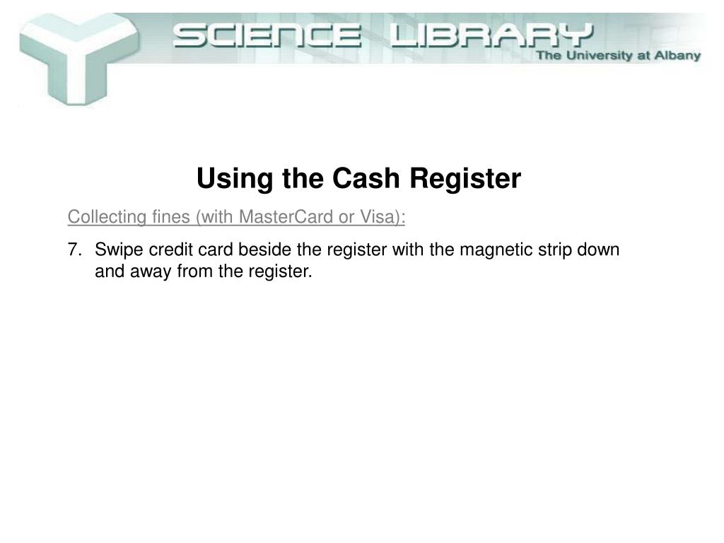 Using the Cash Register • Collecting fines (with MasterCard or Visa): • Swipe credit card beside the register with the magnetic strip down and away from the register.