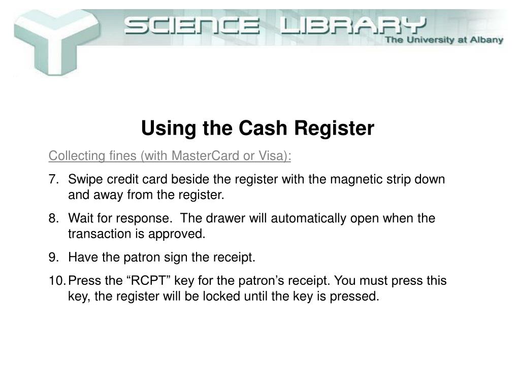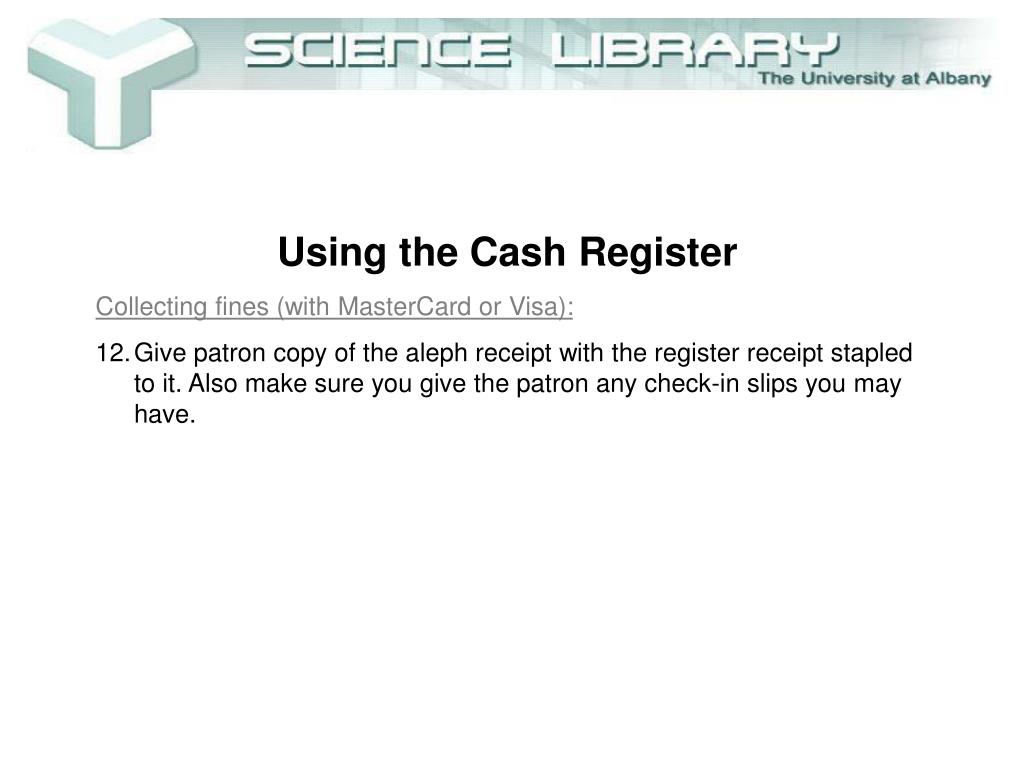 Using the Cash Register • Collecting fines (with MasterCard or Visa): • Give patron copy of the aleph receipt with the register receipt stapled to it. Also make sure you give the patron any check-in slips you may have.