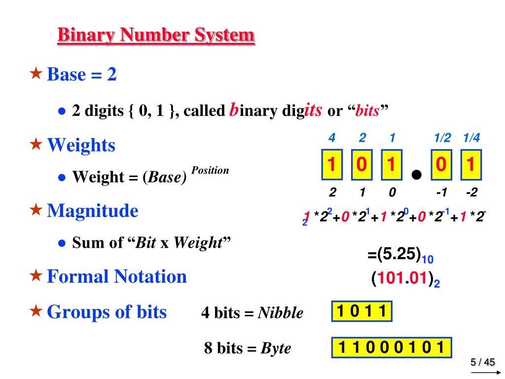 4 2 1 1/2 1/4 2 1 0 -1 -2 Binary Number System • Base = 2 • 2 digits { 0, 1 }, called binary digits or “bits” • Weights • Weight = (Base) Position • Magnitude • Sum of “Bit x Weight” • Formal Notation • Groups of bits 4 bits = Nibble 8 bits = Byte 1 0 1 0 1 1 *22+0 *21+1 *20+0 *2-1+1 *2-2 =(5.25)10 (101.01)2 1 0 1 1 1 1 0 0 0 1 0 1