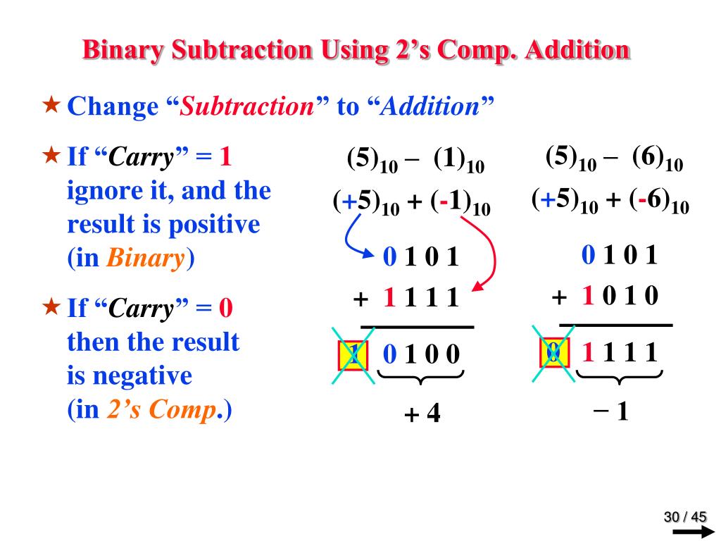 Binary Subtraction Using 2’s Comp. Addition • Change “Subtraction” to “Addition” • If “Carry” = 1ignore it, and the result is positive(in Binary) • If “Carry” = 0then the resultis negative(in 2’s Comp.) (5)10 – (6)10 (5)10 – (1)10 (+5)10 + (-6)10 (+5)10 + (-1)10 0 1 0 1 0 1 0 1 + 1 0 1 0 + 1 1 1 1 0 1 1 1 1 1 0 1 0 0 − 1 + 4