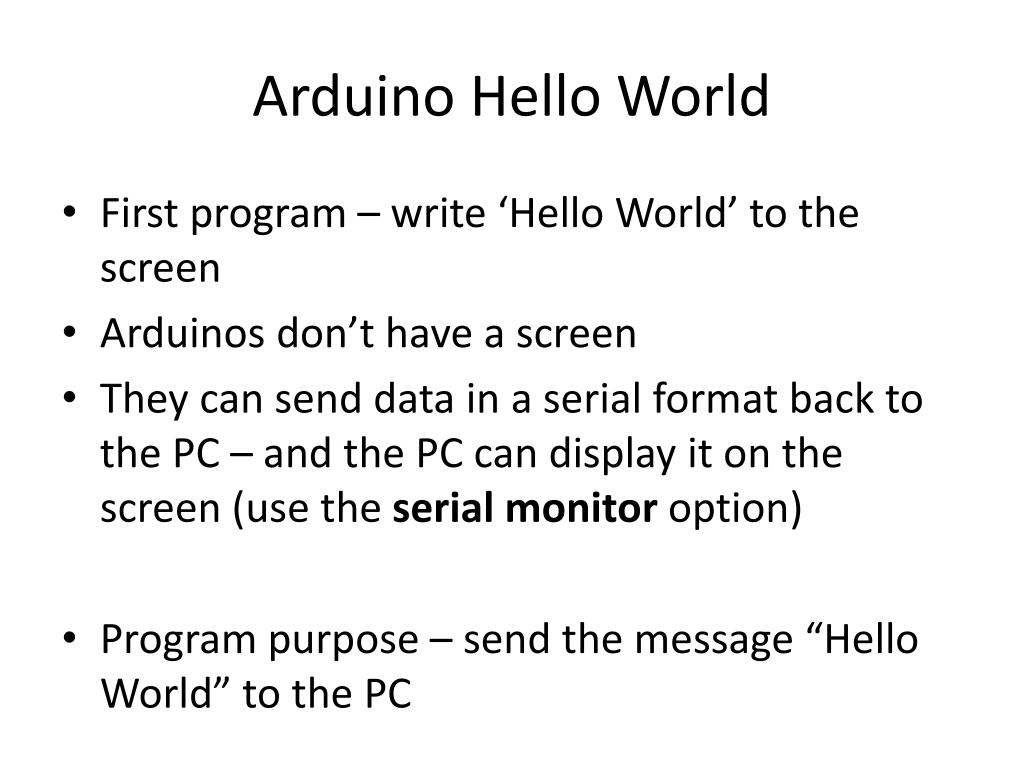 Arduino Hello World • First program – write ‘Hello World’ to the screen • Arduinos don’t have a screen • They can send data in a serial format back to the PC – and the PC can display it on the screen (use the serial monitor option) • Program purpose – send the message “Hello World” to the PC