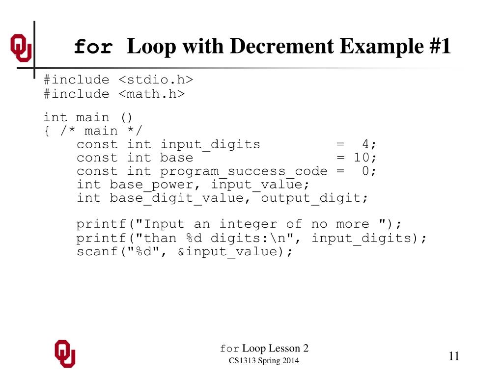 forLoop with Decrement Example #1 #include <stdio.h> #include <math.h> int main () { /* main */ const intinput_digits = 4; const int base = 10; const intprogram_success_code = 0; intbase_power, input_value; intbase_digit_value, output_digit; printf("Input an integer of no more "); printf("than %d digits:\n", input_digits); scanf("%d", &input_value); for Loop Lesson 2 CS1313 Spring 2014