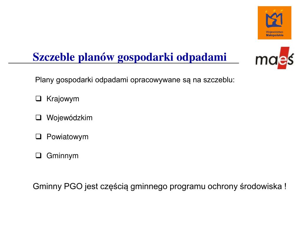 Szczeble planów gospodarki odpadami Plany gospodarki odpadami opracowywane są na szczeblu: • Krajowym • Wojewódzkim • Powiatowym • Gminnym Gminny PGO jest częścią gminnego programu ochrony środowiska !