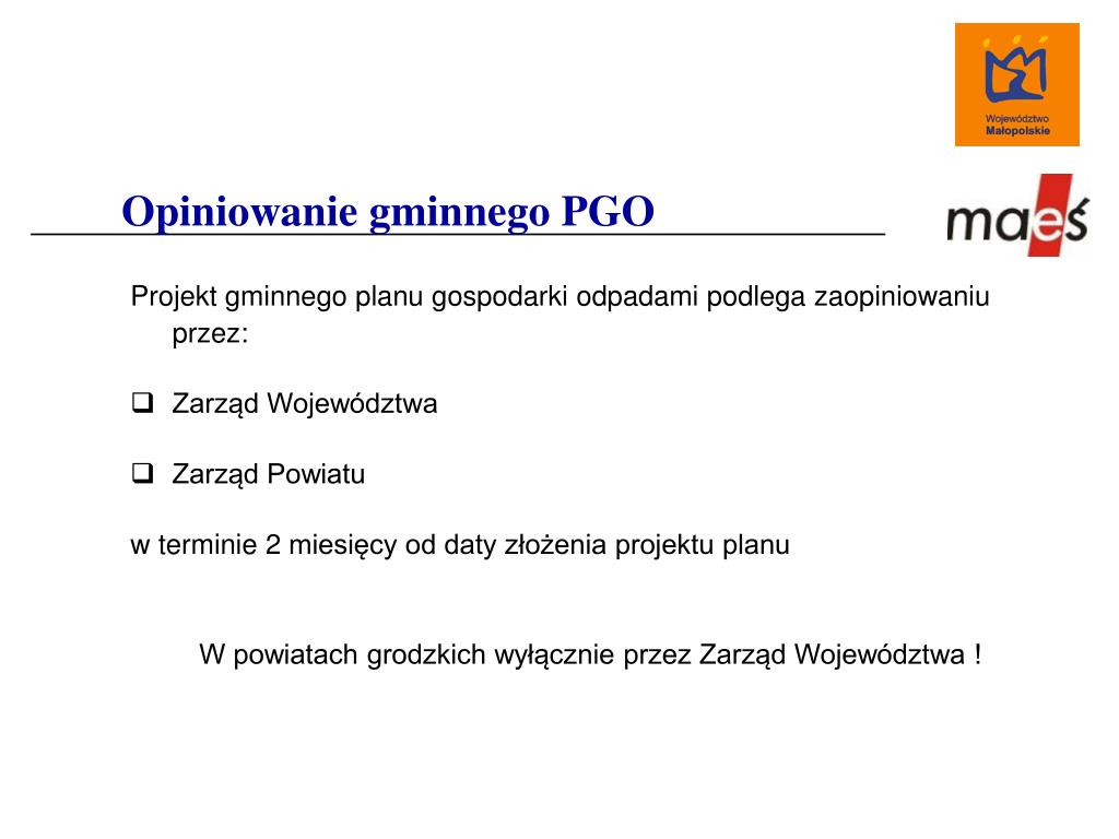 Opiniowanie gminnego PGO Projekt gminnego planu gospodarki odpadami podlega zaopiniowaniu przez: • Zarząd Województwa • Zarząd Powiatu w terminie 2 miesięcy od daty złożenia projektu planu W powiatach grodzkich wyłącznie przez Zarząd Województwa !