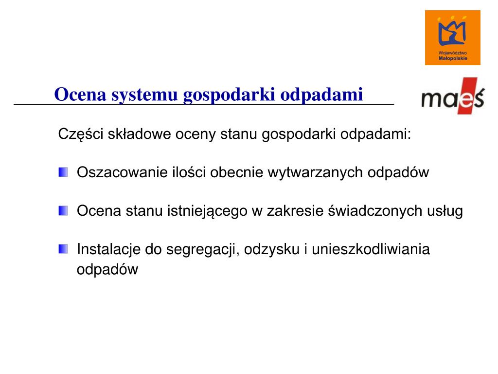 Ocena systemu gospodarki odpadami Części składowe oceny stanu gospodarki odpadami: Oszacowanie ilości obecnie wytwarzanych odpadów Ocena stanu istniejącego w zakresie świadczonych usług Instalacje do segregacji, odzysku i unieszkodliwiania odpadów