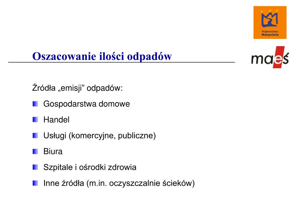 Oszacowanie ilości odpadów Źródła „emisji” odpadów: Gospodarstwa domowe Handel Usługi (komercyjne, publiczne) Biura Szpitale i ośrodki zdrowia Inne źródła (m.in. oczyszczalnie ścieków)