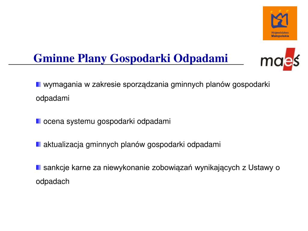 Gminne Plany Gospodarki Odpadami wymagania w zakresie sporządzania gminnych planów gospodarki odpadami ocena systemu gospodarki odpadami aktualizacja gminnych planów gospodarki odpadami sankcje karne za niewykonanie zobowiązań wynikających z Ustawy o odpadach