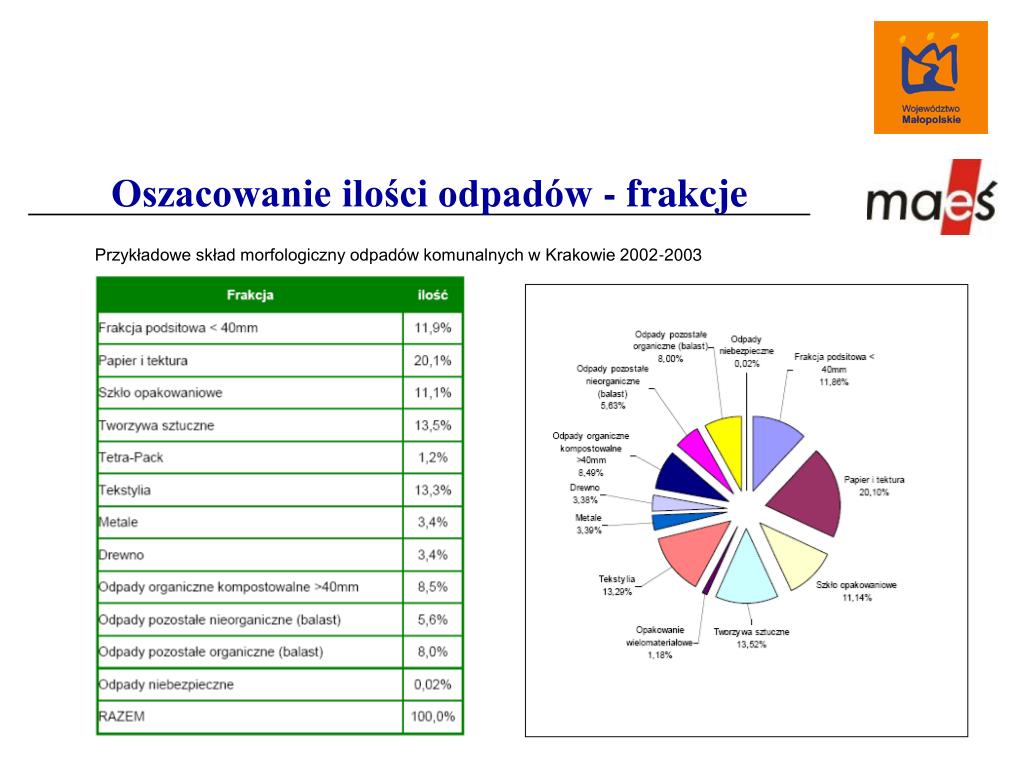 Oszacowanie ilości odpadów - frakcje Przykładowe skład morfologiczny odpadów komunalnych w Krakowie 2002-2003