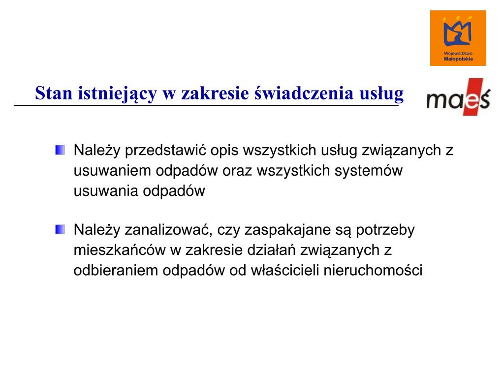 Stan istniejący w zakresie świadczenia usług Należy przedstawić opis wszystkich usług związanych z usuwaniem odpadów oraz wszystkich systemów usuwania odpadów Należy zanalizować, czy zaspakajane są potrzeby mieszkańców w zakresie działań związanych z odbieraniem odpadów od właścicieli nieruchomości