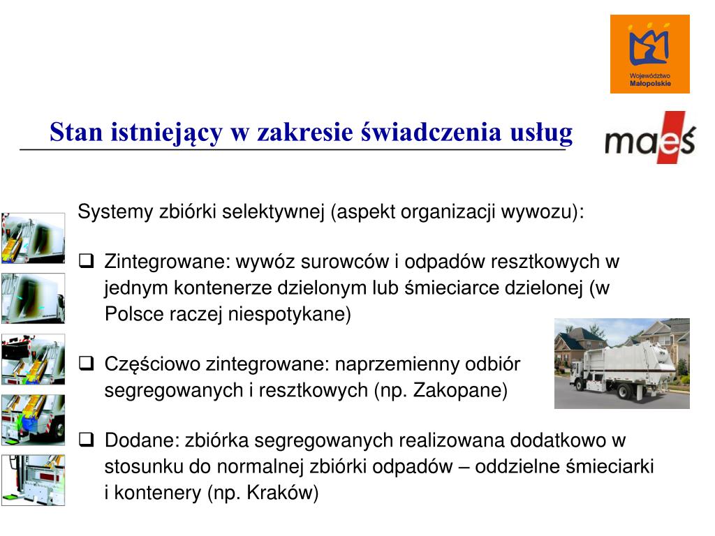 Stan istniejący w zakresie świadczenia usług Systemy zbiórki selektywnej (aspekt organizacji wywozu): • Zintegrowane: wywóz surowców i odpadów resztkowych w jednym kontenerze dzielonym lub śmieciarce dzielonej (w Polsce raczej niespotykane) • Częściowo zintegrowane: naprzemienny odbiór segregowanych i resztkowych (np. Zakopane) • Dodane: zbiórka segregowanych realizowana dodatkowo w stosunku do normalnej zbiórki odpadów – oddzielne śmieciarki i kontenery (np. Kraków)