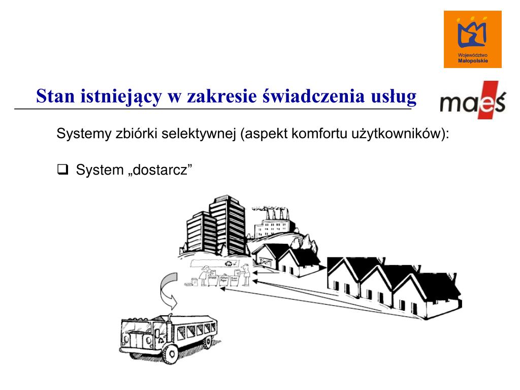 Stan istniejący w zakresie świadczenia usług Systemy zbiórki selektywnej (aspekt komfortu użytkowników): • System „dostarcz”
