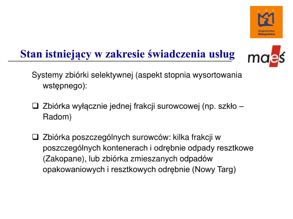 Stan istniejący w zakresie świadczenia usług Systemy zbiórki selektywnej (aspekt stopnia wysortowania wstępnego): • Zbiórka wyłącznie jednej frakcji surowcowej (np. szkło – Radom) • Zbiórka poszczególnych surowców: kilka frakcji w poszczególnych kontenerach i odrębnie odpady resztkowe (Zakopane), lub zbiórka zmieszanych odpadów opakowaniowych i resztkowych odrębnie (Nowy Targ)