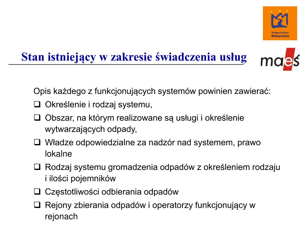 Stan istniejący w zakresie świadczenia usług Opis każdego z funkcjonujących systemów powinien zawierać: • Określenie i rodzaj systemu, • Obszar, na którym realizowane są usługi i określenie wytwarzających odpady, • Władze odpowiedzialne za nadzór nad systemem, prawo lokalne • Rodzaj systemu gromadzenia odpadów z określeniem rodzaju i ilości pojemników • Częstotliwości odbierania odpadów • Rejony zbierania odpadów i operatorzy funkcjonujący w rejonach