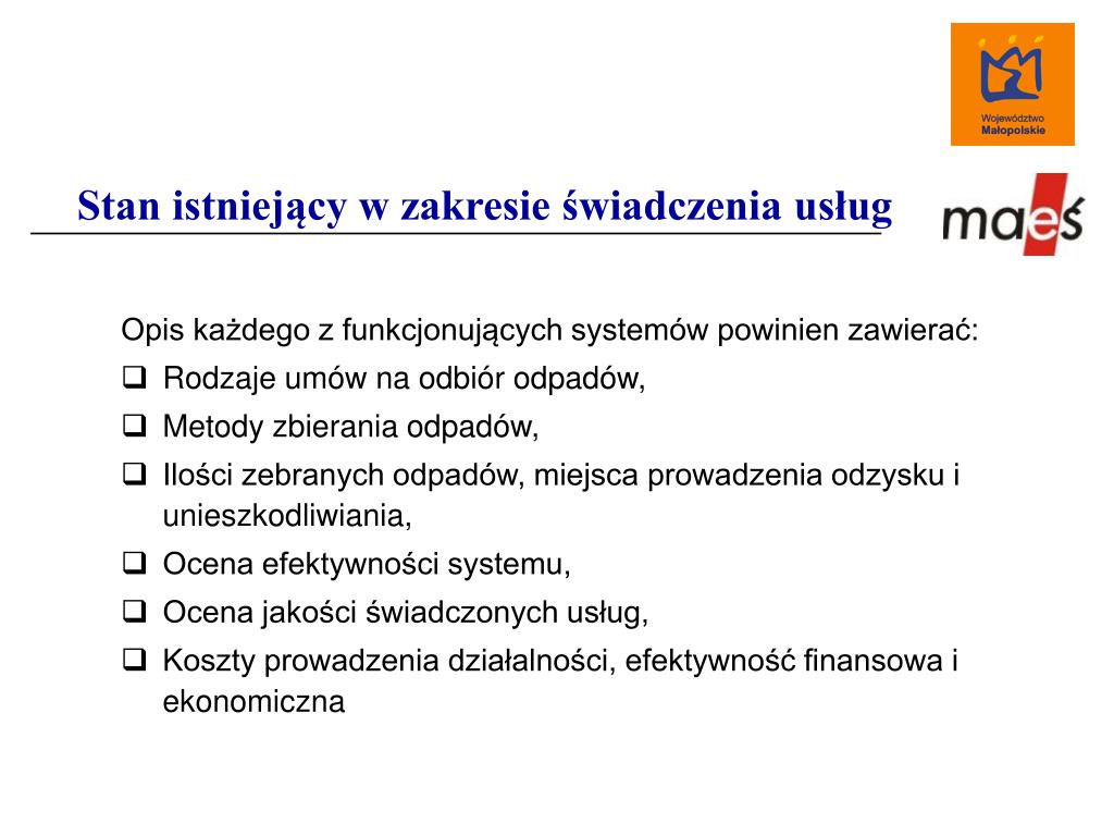 Stan istniejący w zakresie świadczenia usług Opis każdego z funkcjonujących systemów powinien zawierać: • Rodzaje umów na odbiór odpadów, • Metody zbierania odpadów, • Ilości zebranych odpadów, miejsca prowadzenia odzysku i unieszkodliwiania, • Ocena efektywności systemu, • Ocena jakości świadczonych usług, • Koszty prowadzenia działalności, efektywność finansowa i ekonomiczna