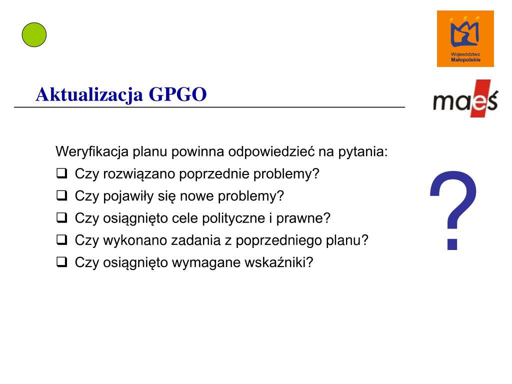 Aktualizacja GPGO Weryfikacja planu powinna odpowiedzieć na pytania: • Czy rozwiązano poprzednie problemy? • Czy pojawiły się nowe problemy? • Czy osiągnięto cele polityczne i prawne? • Czy wykonano zadania z poprzedniego planu? • Czy osiągnięto wymagane wskaźniki? ?