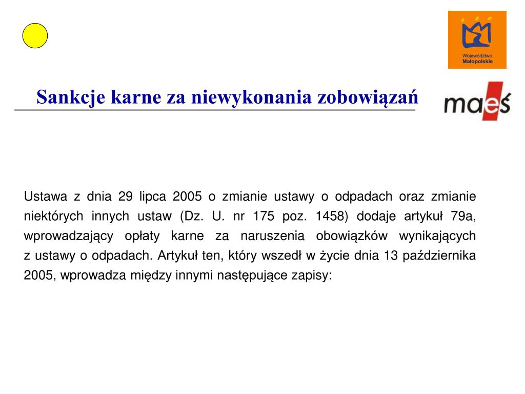 Sankcje karne za niewykonania zobowiązań Ustawa z dnia 29 lipca 2005 o zmianie ustawy o odpadach oraz zmianie niektórych innych ustaw (Dz. U. nr 175 poz. 1458) dodaje artykuł 79a, wprowadzający opłaty karne za naruszenia obowiązków wynikających z ustawy o odpadach. Artykuł ten, który wszedł w życie dnia 13 października 2005, wprowadza między innymi następujące zapisy: