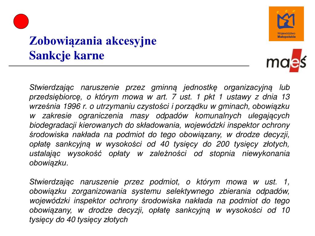 Zobowiązania akcesyjneSankcje karne Stwierdzając naruszenie przez gminną jednostkę organizacyjną lub przedsiębiorcę, o którym mowa w art. 7 ust. 1 pkt 1 ustawy z dnia 13 września 1996 r. o utrzymaniu czystości i porządku w gminach, obowiązku w zakresie ograniczenia masy odpadów komunalnych ulegających biodegradacji kierowanych do składowania, wojewódzki inspektor ochrony środowiska nakłada na podmiot do tego obowiązany, w drodze decyzji, opłatę sankcyjną w wysokości od 40 tysięcy do 200 tysięcy złotych, ustalając wysokość opłaty w zależności od stopnia niewykonania obowiązku. Stwierdzając naruszenie przez podmiot, o którym mowa w ust. 1, obowiązku zorganizowania systemu selektywnego zbierania odpadów, wojewódzki inspektor ochrony środowiska nakłada na podmiot do tego obowiązany, w drodze decyzji, opłatę sankcyjną w wysokości od 10 tysięcy do 40 tysięcy złotych