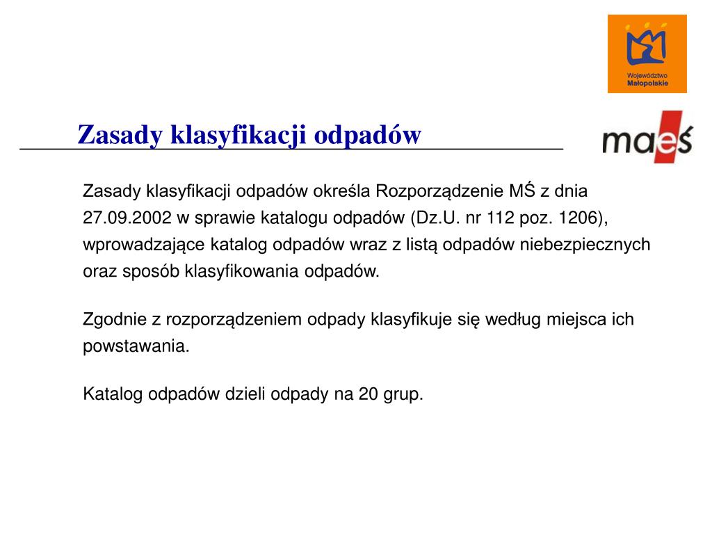Zasady klasyfikacji odpadów Zasady klasyfikacji odpadów określa Rozporządzenie MŚ z dnia 27.09.2002 w sprawie katalogu odpadów (Dz.U. nr 112 poz. 1206), wprowadzające katalog odpadów wraz z listą odpadów niebezpiecznych oraz sposób klasyfikowania odpadów. Zgodnie z rozporządzeniem odpady klasyfikuje się według miejsca ich powstawania. Katalog odpadów dzieli odpady na 20 grup.