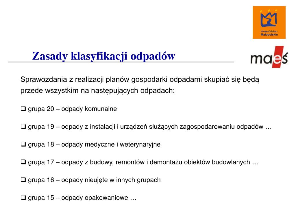 Zasady klasyfikacji odpadów Sprawozdania z realizacji planów gospodarki odpadami skupiać się będą przede wszystkim na następujących odpadach: • grupa 20 – odpady komunalne • grupa 19 – odpady z instalacji i urządzeń służących zagospodarowaniu odpadów … • grupa 18 – odpady medyczne i weterynaryjne • grupa 17 – odpady z budowy, remontów i demontażu obiektów budowlanych … • grupa 16 – odpady nieujęte w innych grupach • grupa 15 – odpady opakowaniowe …