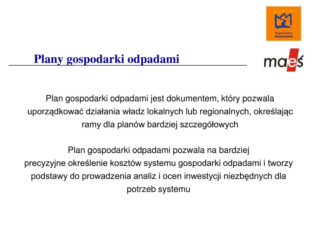 Plany gospodarki odpadami Plan gospodarki odpadami jest dokumentem, który pozwala uporządkować działania władz lokalnych lub regionalnych, określając ramy dla planów bardziej szczegółowych Plan gospodarki odpadami pozwala na bardziej precyzyjne określenie kosztów systemu gospodarki odpadami i tworzy podstawy do prowadzenia analiz i ocen inwestycji niezbędnych dla potrzeb systemu