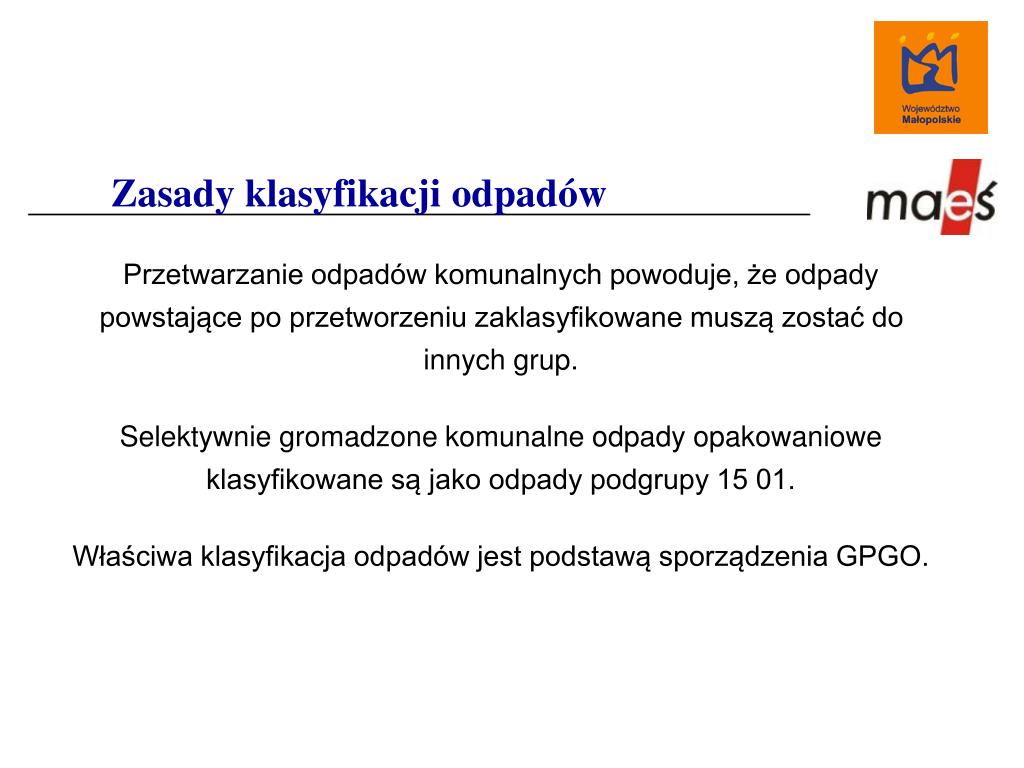 Zasady klasyfikacji odpadów Przetwarzanie odpadów komunalnych powoduje, że odpady powstające po przetworzeniu zaklasyfikowane muszą zostać do innych grup. Selektywnie gromadzone komunalne odpady opakowaniowe klasyfikowane są jako odpady podgrupy 15 01. Właściwa klasyfikacja odpadów jest podstawą sporządzenia GPGO.