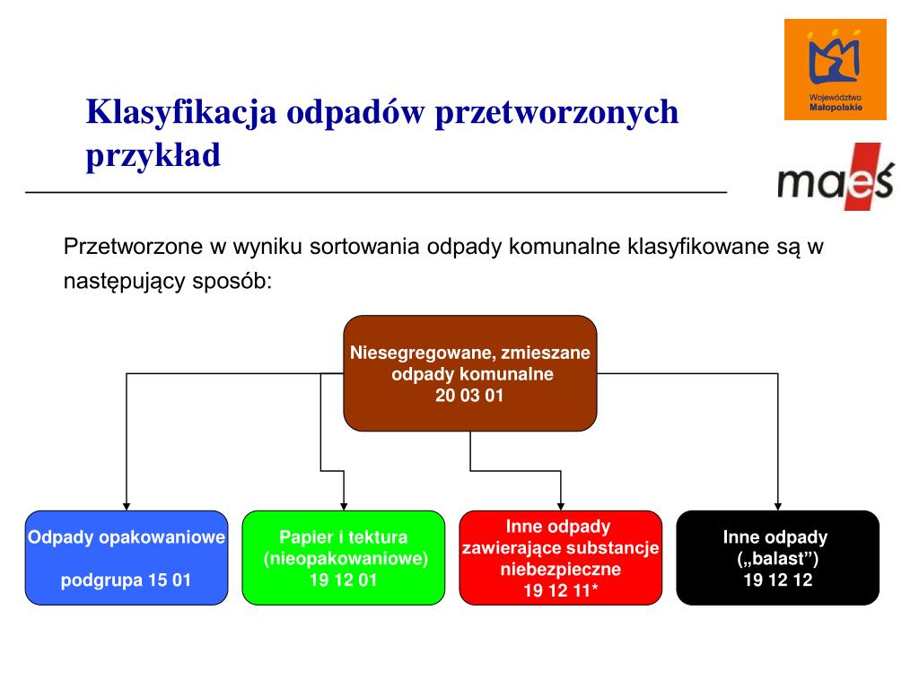 Klasyfikacja odpadów przetworzonychprzykład Przetworzone w wyniku sortowania odpady komunalne klasyfikowane są w następujący sposób: Niesegregowane, zmieszane odpady komunalne20 03 01 Odpady opakowaniowe podgrupa 15 01 Papier i tektura (nieopakowaniowe)19 12 01 Inne odpady zawierające substancjeniebezpieczne 19 12 11* Inne odpady („balast”) 19 12 12