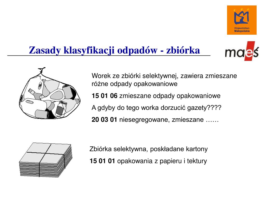 Zasady klasyfikacji odpadów - zbiórka Worek ze zbiórki selektywnej, zawiera zmieszane różne odpady opakowaniowe 15 01 06 zmieszane odpady opakowaniowe A gdyby do tego worka dorzucić gazety???? 20 03 01 niesegregowane, zmieszane …… Zbiórka selektywna, poskładane kartony 15 01 01 opakowania z papieru i tektury