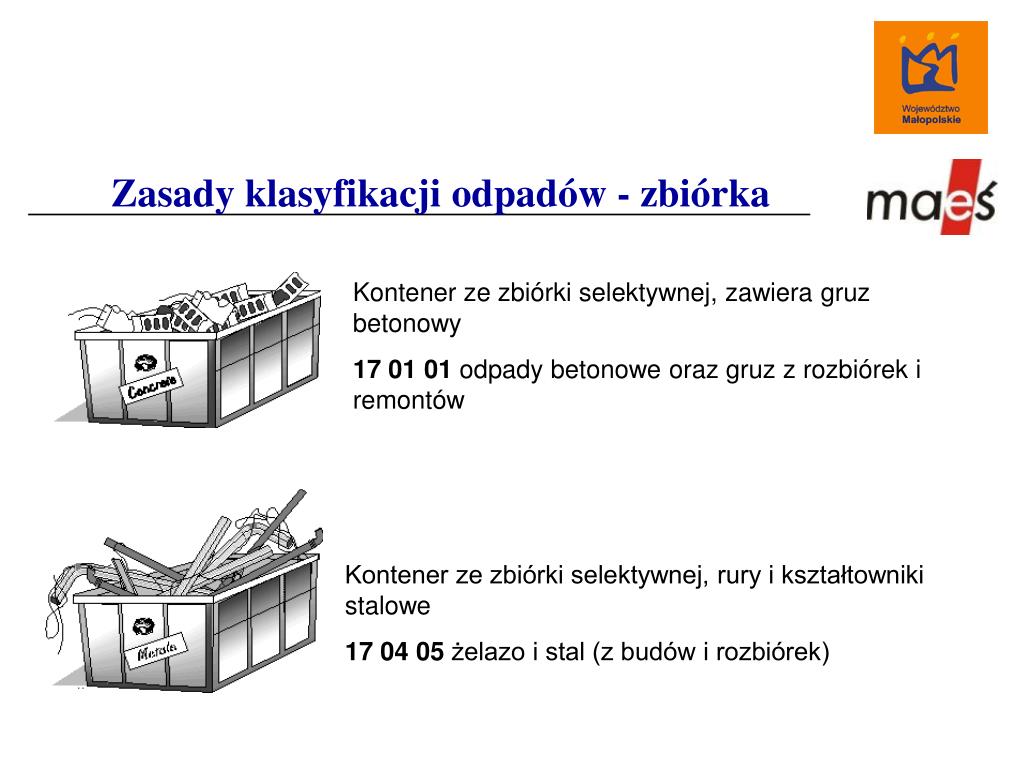 Zasady klasyfikacji odpadów - zbiórka Kontener ze zbiórki selektywnej, zawiera gruz betonowy 17 01 01 odpady betonowe oraz gruz z rozbiórek i remontów Kontener ze zbiórki selektywnej, rury i kształtowniki stalowe 17 04 05 żelazo i stal (z budów i rozbiórek)
