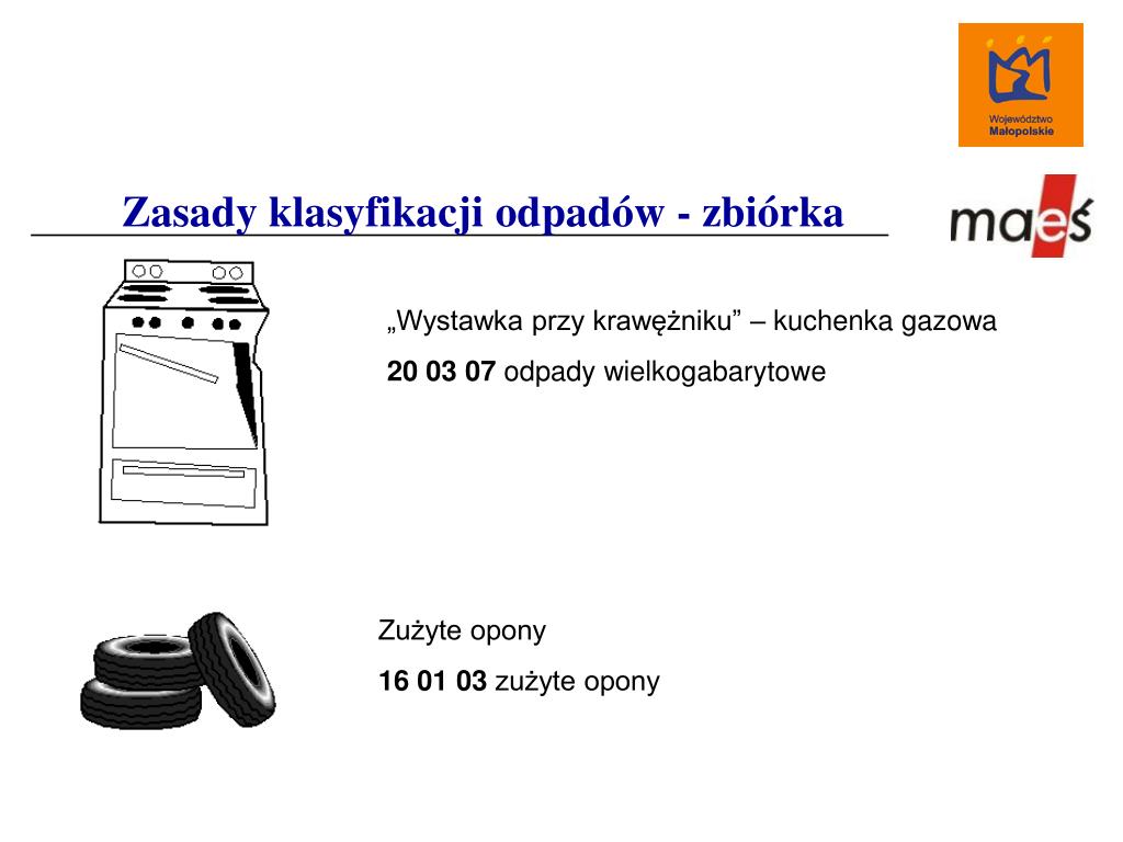 Zasady klasyfikacji odpadów - zbiórka „Wystawka przy krawężniku” – kuchenka gazowa 20 03 07 odpady wielkogabarytowe Zużyte opony 16 01 03 zużyte opony