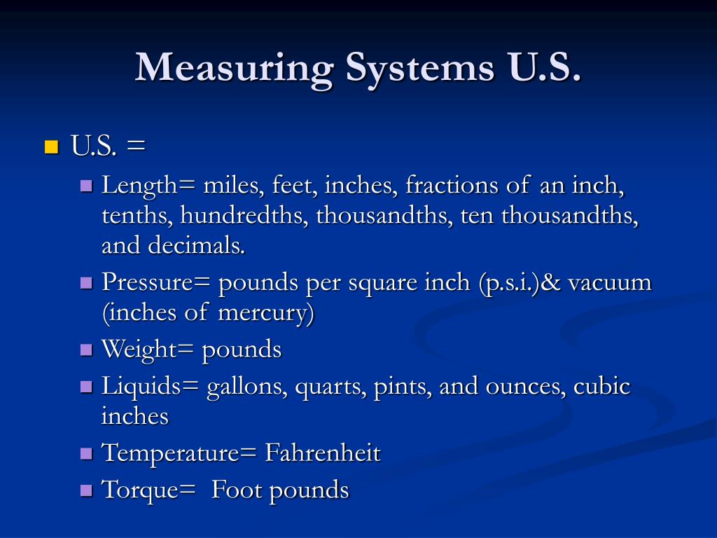Measuring Systems U.S. • U.S. = • Length= miles, feet, inches, fractions of an inch, tenths, hundredths, thousandths, ten thousandths, and decimals. • Pressure= pounds per square inch (p.s.i.)& vacuum (inches of mercury) • Weight= pounds • Liquids= gallons, quarts, pints, and ounces, cubic inches • Temperature= Fahrenheit • Torque= Foot pounds