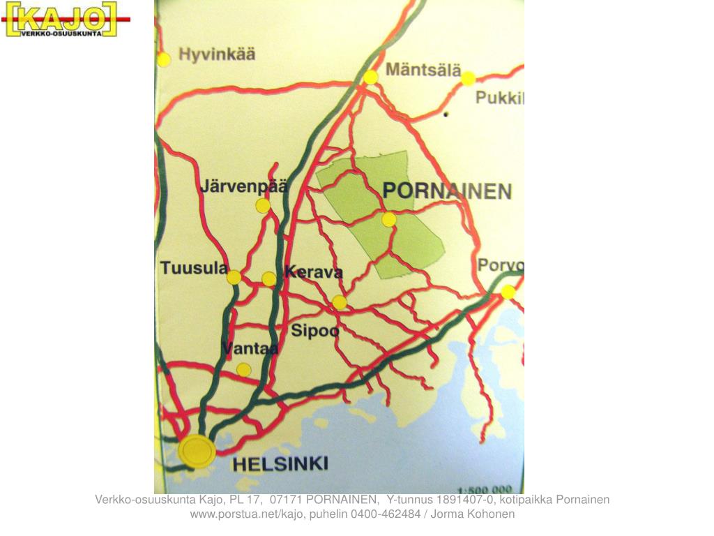 Tietoliikennepalvelut • Pornaisissa Soneran ADSL • Mäntsälässä Soneran ja Elisan ADSL • Mäntsälässä ja suuressa osassa Pornaisia MSOY:n WLAN-verkko Verkko-osuuskunta Kajo, PL 17, 07171 PORNAINEN, Y-tunnus 1891407-0, kotipaikka Pornainen www.porstua.net/kajo, puhelin 0400-462484 / Jorma Kohonen