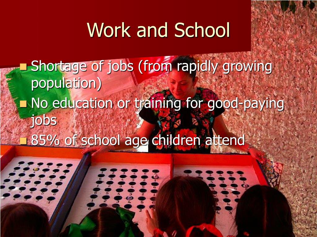 Work and School • Shortage of jobs (from rapidly growing population) • No education or training for good-paying jobs • 85% of school age children attend