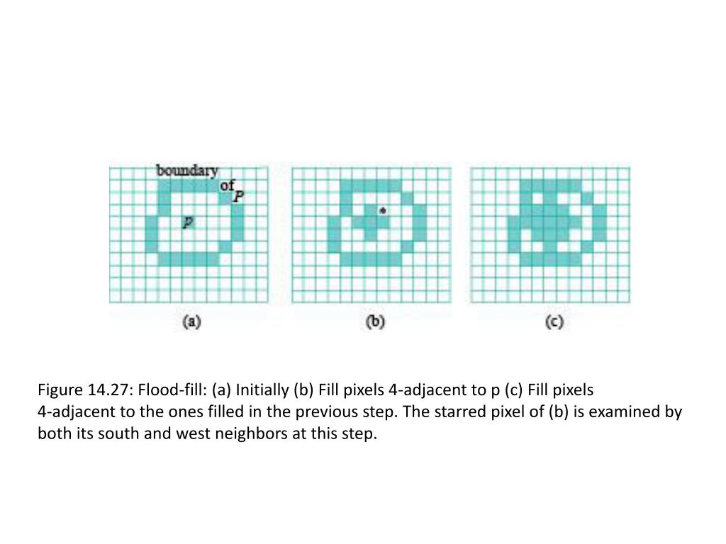 Figure 14.27: Flood-fill: (a) Initially (b) Fill pixels 4-adjacent to p (c) Fill pixels 4-adjacent to the ones filled in the previous step. The starred pixel of (b) is examined by both its south and west neighbors at this step.