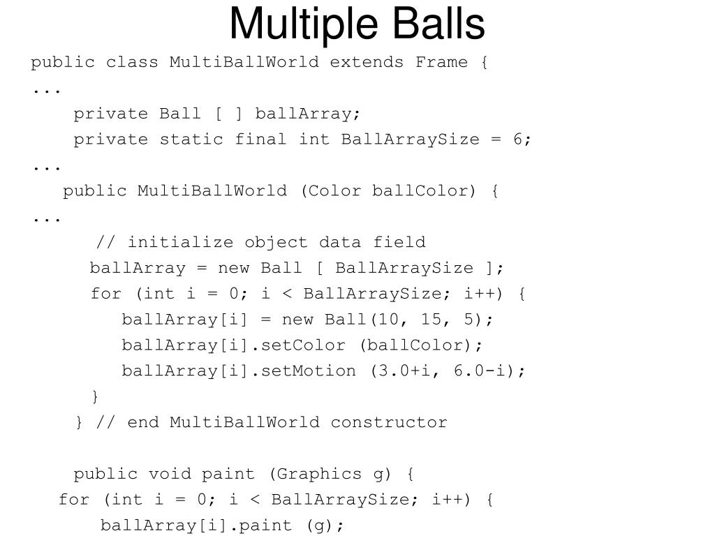 Multiple Balls ... public void paint (Graphics g) { for (int i = 0; i < BallArraySize; i++) { ballArray[i].paint (g); // then move it slightly ballArray[i].move(); if ((ballArray[i].x()<0)|| (ballArray[i].x() > FrameWidth)) ballArray[i].setMotion (-ballArray[i].xMotion(), ballArray[i].yMotion()); if ((ballArray[i].y()<0)||(ballArray[i].y() > FrameHeight)) ballArray[i].setMotion (ballArray[i].xMotion(), -ballArray[i].yMotion()); } // end for ... } // end paint
