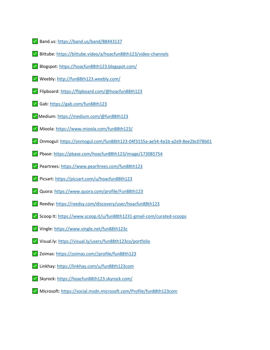 Band.us: https://band.us/band/88443137 Bittube: https://bittube.video/a/hoacfun88th123/video-channels Blogspot: https://hoacfun88th123.blogspot.com/ Weebly: http://fun88th123.weebly.com/ Flipboard: https://flipboard.com/@hoacfun88th123 Gab: https://gab.com/fun88th123 Medium: https://medium.com/@fun88th123 Mioola: https://www.mioola.com/fun88th123/ Onmogul: https://onmogul.com/fun88th123-04f3155a-ae54-4a1b-a2e9-8ee2bc078b01 Pbase: https://pbase.com/hoacfun88th123/image/173085754 Peartrees: https://www.pearltrees.com/fun88th123 Picsart: https://picsart.com/u/hoacfun88th123 Quora: https://www.quora.com/profile/Fun88th123 Reedsy: https://reedsy.com/discovery/user/hoacfun88th123 Scoop It: https://www.scoop.it/u/fun88th1231-gmail-com/curated-scoops Vingle: https://www.vingle.net/fun88th123c Visual.ly: https://visual.ly/users/fun88th123co/portfolio Zoimas: https://zoimas.com//profile/fun88th123 Linkhay: https://linkhay.com/u/fun88th123com Skyrock: https://hoacfun88th123.skyrock.com/ Microsoft: https://social.msdn.microsoft.com/Profile/fun88th123com