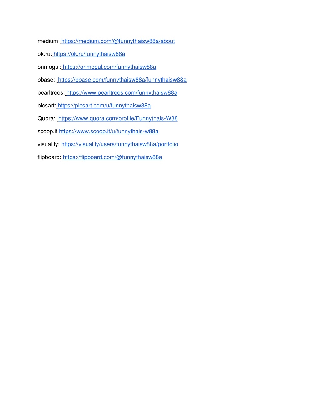 medium: https://medium.com/@funnythaisw88a/about ok.ru: https://ok.ru/funnythaisw88a onmogul: https://onmogul.com/funnythaisw88a pbase: https://pbase.com/funnythaisw88a/funnythaisw88a pearltrees: https://www.pearltrees.com/funnythaisw88a picsart: https://picsart.com/u/funnythaisw88a Quora: https://www.quora.com/profile/Funnythais-W88 scoop.it https://www.scoop.it/u/funnythais-w88a visual.ly: https://visual.ly/users/funnythaisw88a/portfolio flipboard: https://flipboard.com/@funnythaisw88a