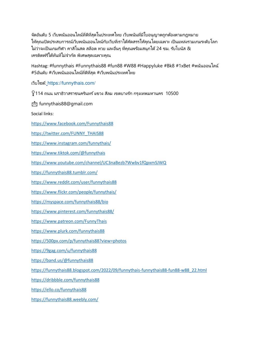 จัดอันดับ 5 เว็บพนันออนไลน์ที่ดีที่สุดในประเทศไทยเว็บพนันที่มีใบอนุญาตถูกต้องตามกฎหมาย ให้คุณเปิดประสบการณ์เว็บพนันออนไลน์กับเว็บที่เราได้คัดสรรให้คุณโดยเฉพาะเป็นแหล่งรวมเกมระดับโลก ไม่ว่าจะเป็นเกมกีฬาคาสิโนสดสล็อตหวยและอื่นๆที่คุณพร้อมสนุกได้ 24 ชม. รับโบนัส & เครดิตฟรีได้ทันทีไม่จ ากัดพิเศษสุดเฉพาะคุณ Hashtag: #funnythais #Funnythais88 #fun88 #W88 #Happyluke #Bk8 #1xBet #พนันออนไลน์ #5อันดับ #เว็บพนันออนไลน์ที่ดีที่สุด #เว็บพนันประเทศไทย เว็บไซต์:https://funnythais.com/ ?114 ถนนนราธิวาสราชนครินทร์แขวงสีลมเขตบางรักกรุงเทพมหานคร 10500 ? funnythais88@gmail.com Social links: https://www.facebook.com/Funnythais88 https://twitter.com/FUNNY_THAIS88 https://www.instagram.com/funnythais/ https://www.tiktok.com/@funnythais https://www.youtube.com/channel/UC3naBezb7Wwbv1fQpxmSJWQ https://funnythais88.tumblr.com/ https://www.reddit.com/user/funnythais88 https://www.flickr.com/people/funnythais/ https://myspace.com/funnythais88/bio https://www.pinterest.com/funnythais88/ https://www.patreon.com/FunnyThais https://www.plurk.com/funnythais88 https://500px.com/p/funnythais88?view=photos https://9gag.com/u/funnythais88 https://band.us/@funnythais88 https://funnythais88.blogspot.com/2022/09/funnythais-funnythais88-fun88-w88_22.html https://dribbble.com/funnythais88 https://ello.co/funnythais88 https://funnythais88.weebly.com/