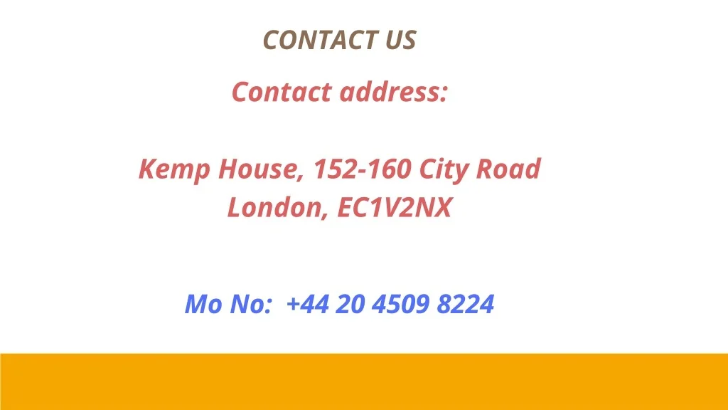CONTACT US Contact address: Kemp House, 152-160 City Road London, EC1V2NX Mo No: +44 20 4509 8224