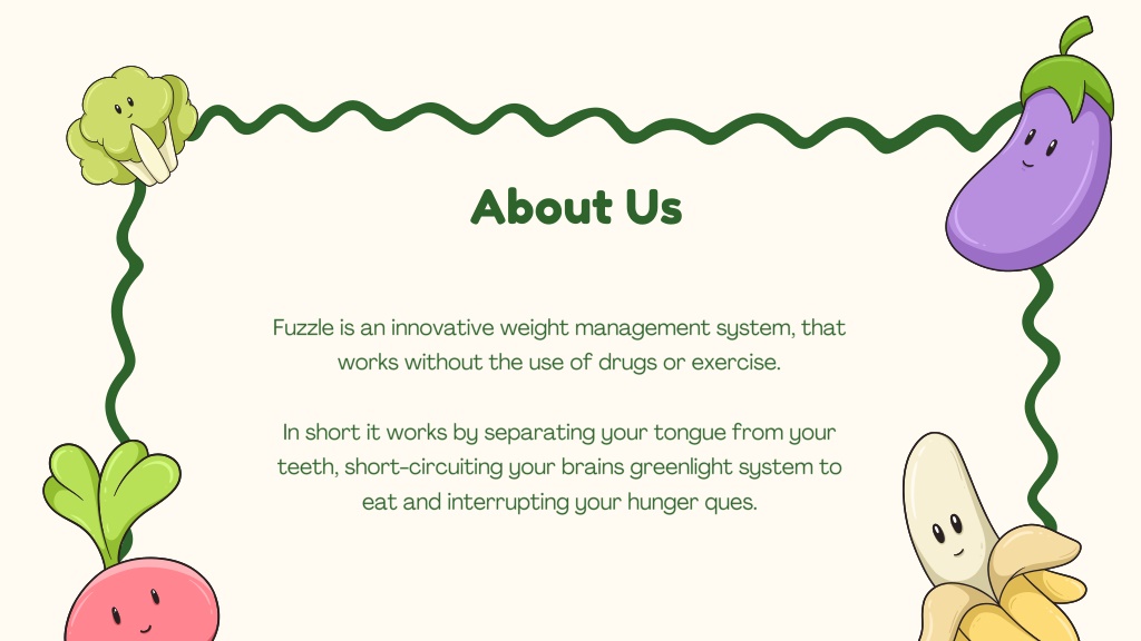 About Us Fuzzle is an innovative weight management system, that works without the use of drugs or exercise. In short it works by separating your tongue from your teeth, short-circuiting your brains greenlight system to eat and interrupting your hunger ques.
