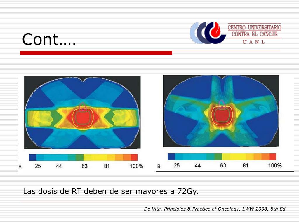 Cont…. Las dosis de RT deben de ser mayores a 72Gy. De Vita, Principles & Practice of Oncology, LWW 2008, 8th Ed