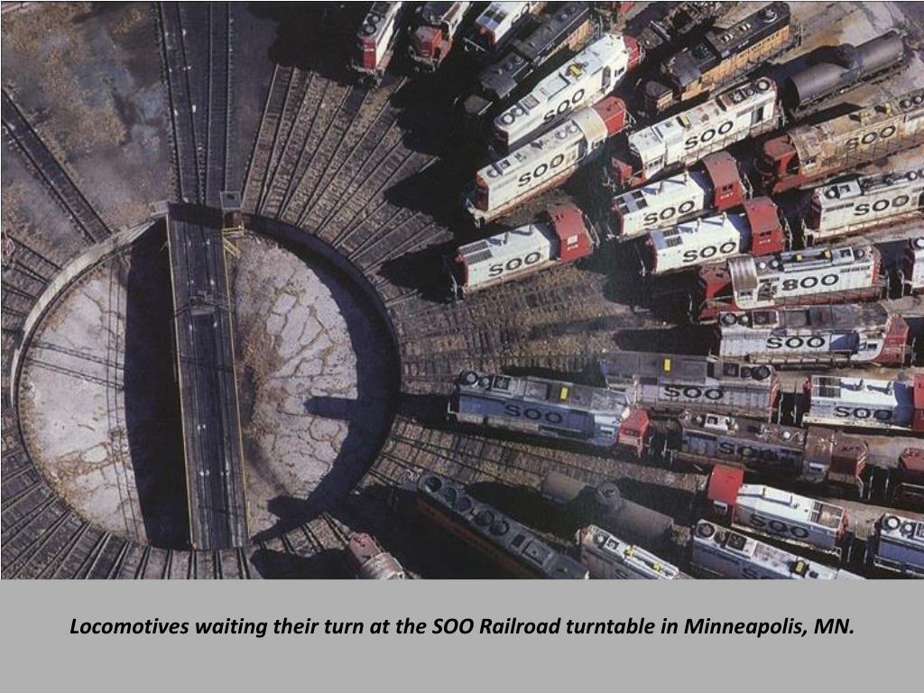 Locomotives waiting their turn at the SOO Railroad turntable in Minneapolis, MN.