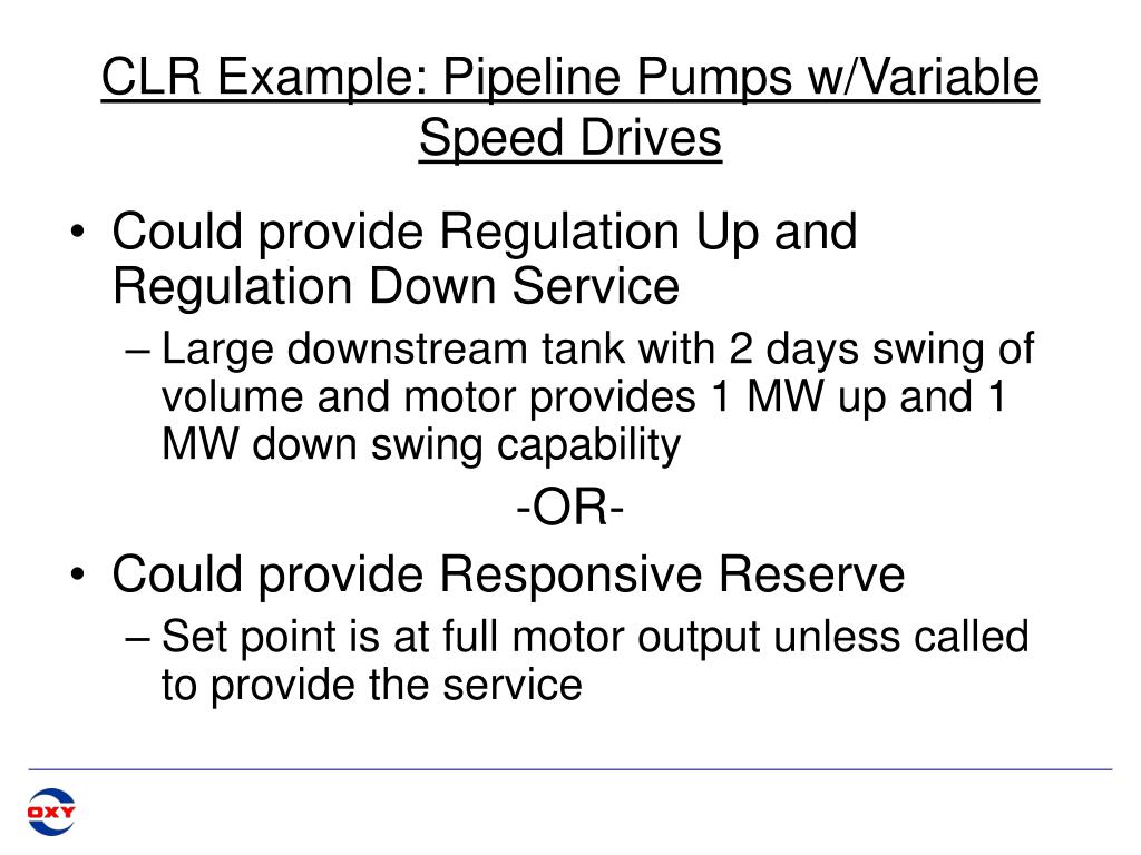 CLR Example: Pipeline Pumps w/Variable Speed Drives • Could provide Regulation Up and Regulation Down Service • Large downstream tank with 2 days swing of volume and motor provides 1 MW up and 1 MW down swing capability -OR- • Could provide Responsive Reserve • Set point is at full motor output unless called to provide the service