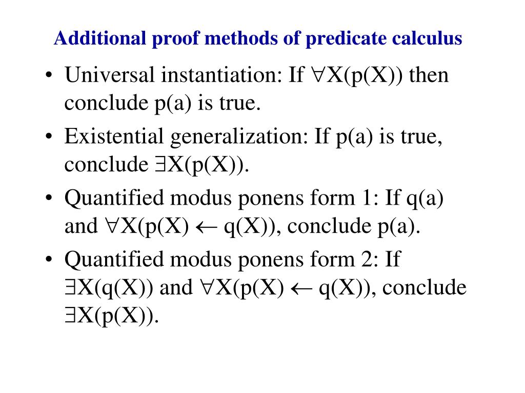 Additional proof methods of predicate calculus • Universal instantiation: If X(p(X)) then conclude p(a) is true. • Existential generalization: If p(a) is true, conclude X(p(X)). • Quantified modus ponens form 1: If q(a) and X(p(X) q(X)), conclude p(a). • Quantified modus ponens form 2: If X(q(X)) and X(p(X) q(X)), conclude X(p(X)).