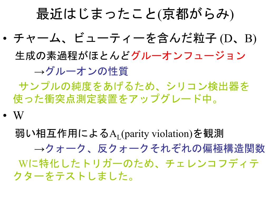 最近はじまったこと(京都がらみ) • チャーム、ビューティーを含んだ粒子 (D、B) 生成の素過程がほとんどグルーオンフュージョン →グルーオンの性質 サンプルの純度をあげるため、シリコン検出器を使った衝突点測定装置をアップグレード中。 • W 弱い相互作用によるAL(parity violation)を観測 →クォーク、反クォークそれぞれの偏極構造関数 Wに特化したトリガーのため、チェレンコフディテクターをテストしました。
