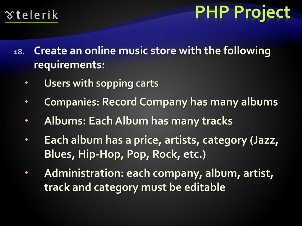 PHP Project Create an online music store with the following requirements: Users with sopping carts Companies: Record Company has many albums Albums: Each Album has many tracks Each album has a price, artists, category (Jazz, Blues, Hip-Hop, Pop, Rock, etc.) Administration: each company, album, artist, track and category must be editable