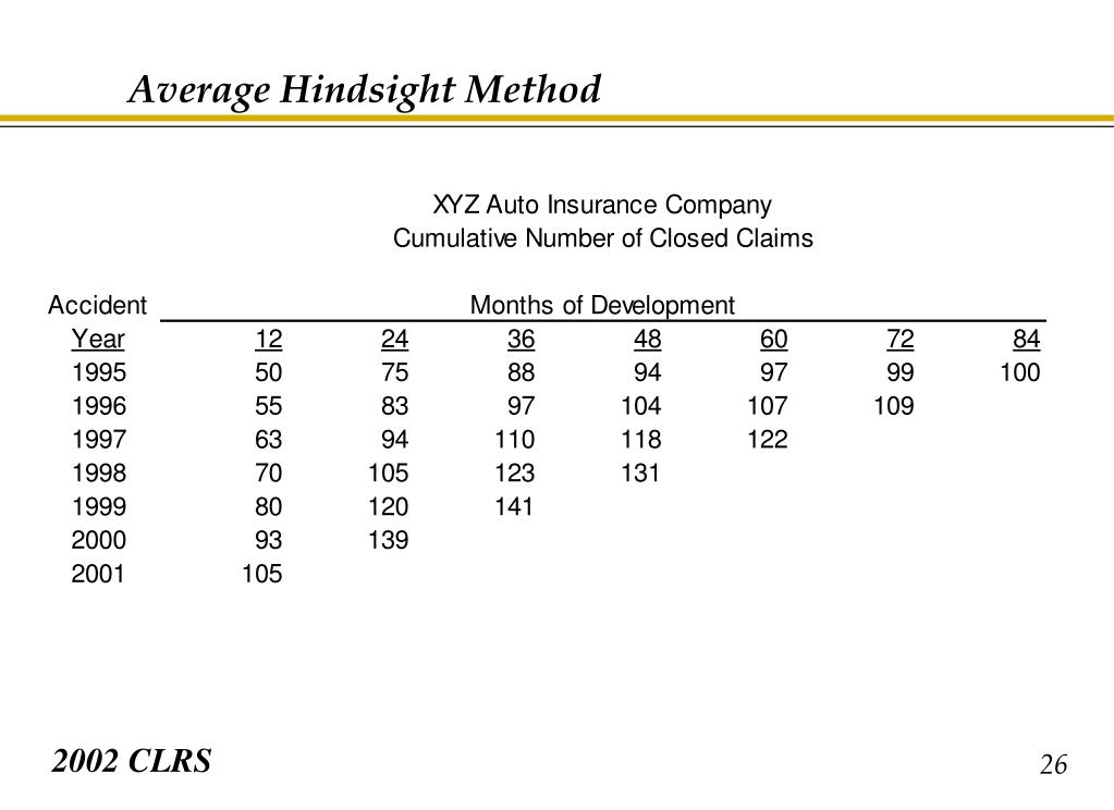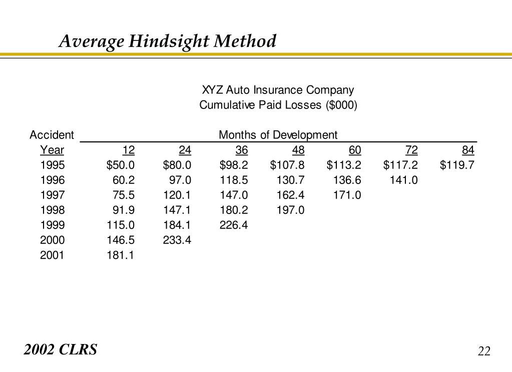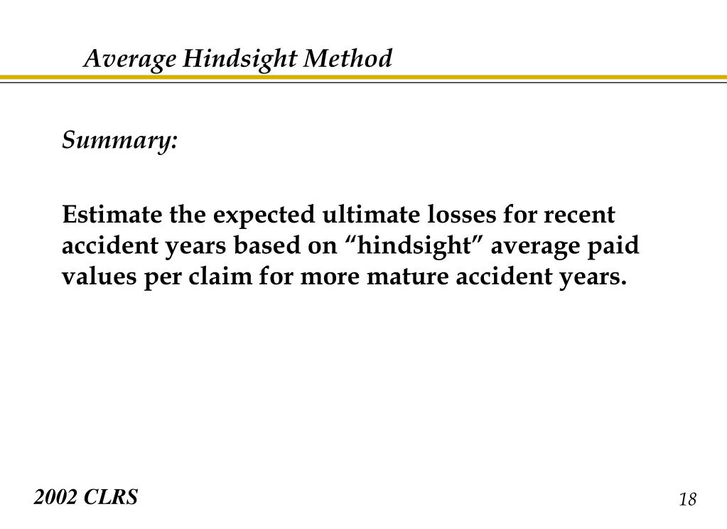 Summary: Estimate the expected ultimate losses for recent accident years based on “hindsight” average paid values per claim for more mature accident years. Average Hindsight Method