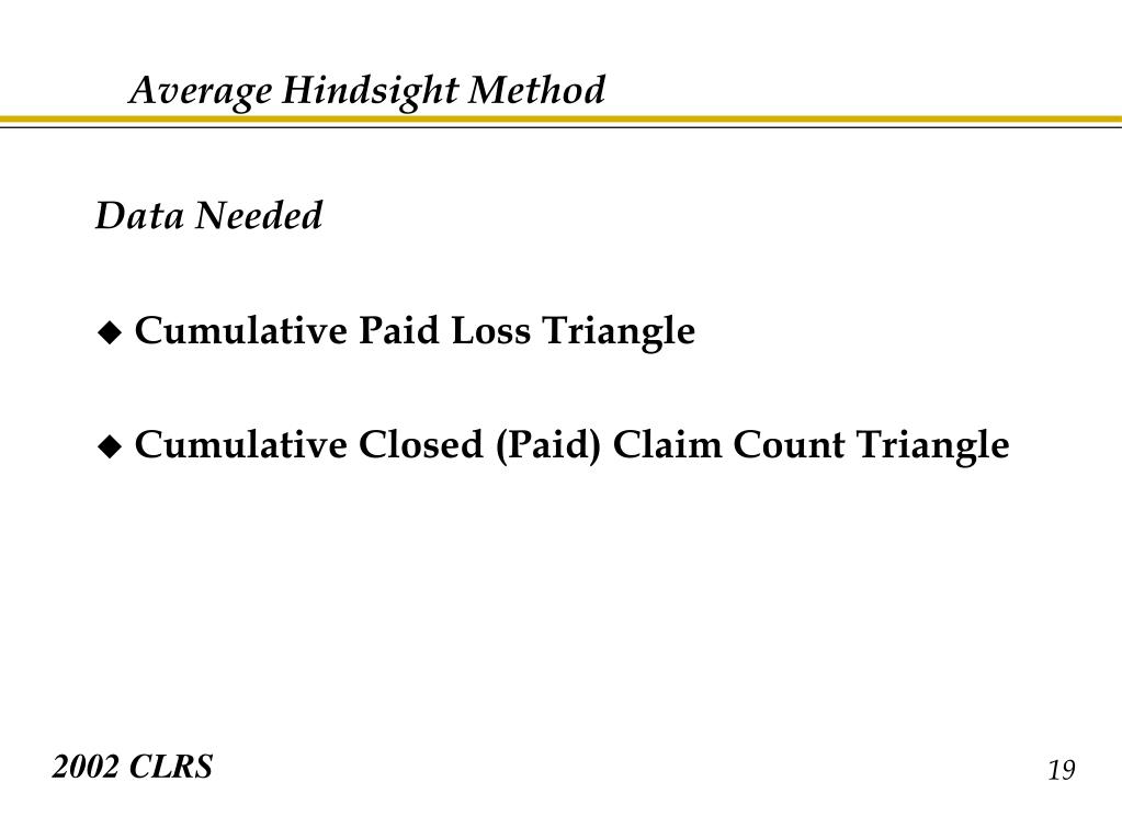 Data Needed Cumulative Paid Loss Triangle Cumulative Closed (Paid) Claim Count Triangle Average Hindsight Method