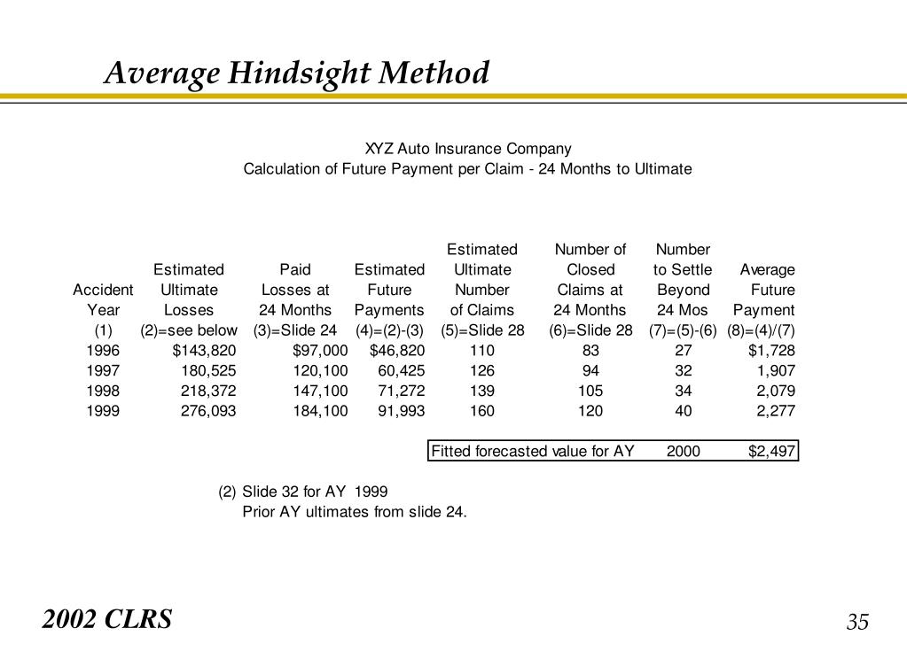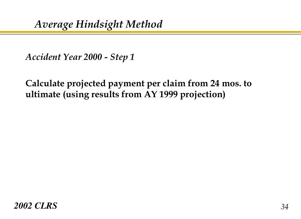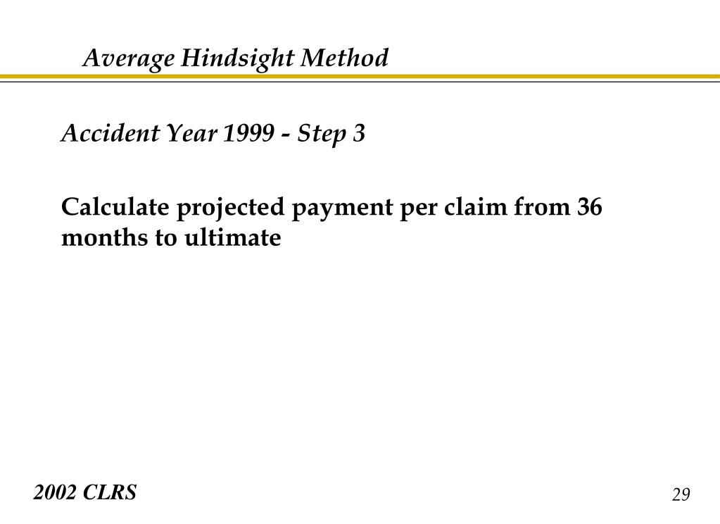 Steps to Project Accident Year 2000 Ultimate Loss (1) Calculate projected payment per claim from 24 mos. to ultimate (using results from AY 1999 projection) (2) Calculate total future payments for AY 2000 (3) Calculate estimated ultimate losses for AY 2000 Average Hindsight Method