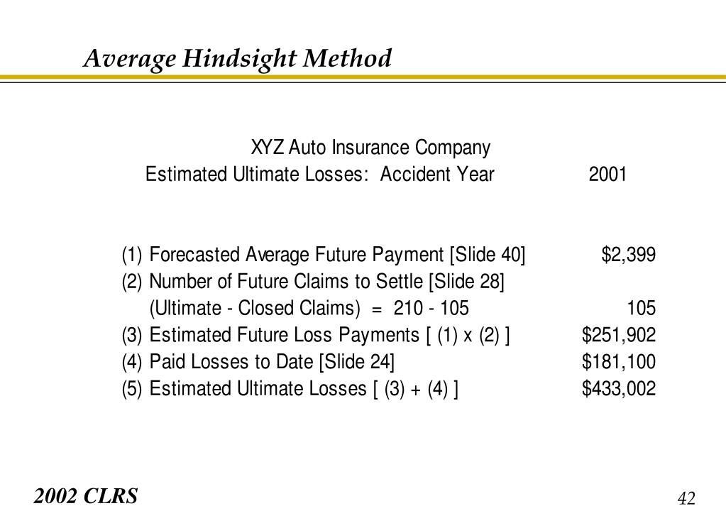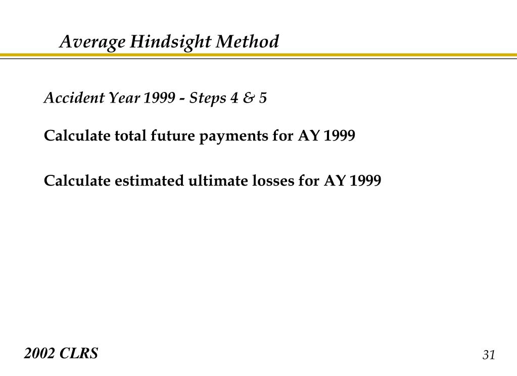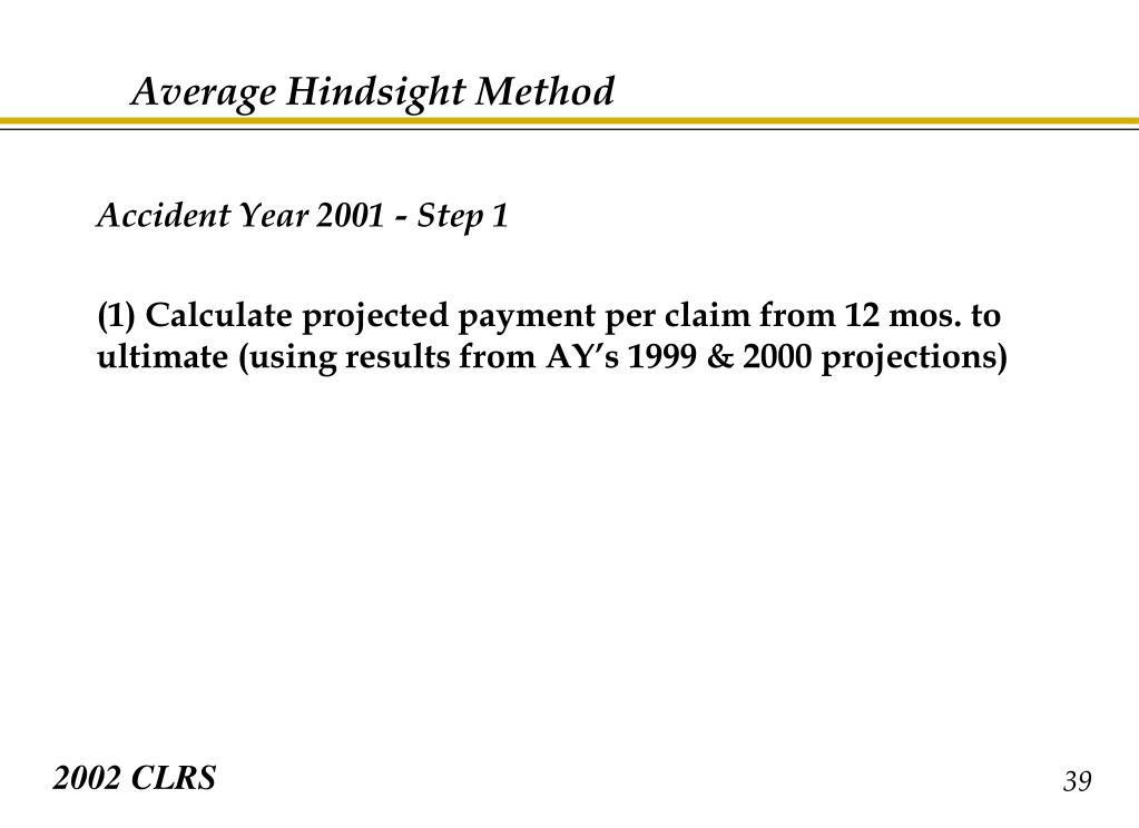 Steps to Project Accident Year 2001 Ultimate Loss (1) Calculate projected payment per claim from 12 mos. to ultimate (using results from AY’s 1999 & 2000 projections) (2) Calculate total future payments for AY 2001 (3) Calculate estimated ultimate losses for AY 2001 Average Hindsight Method
